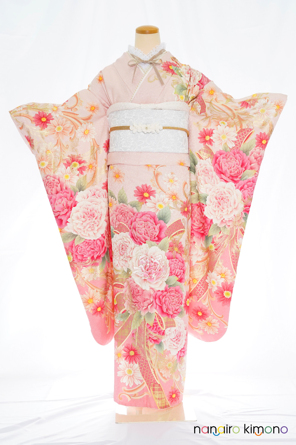 白とピンクの大きな牡丹と華リボンが印象的で上品にも着こなしていただける一着です。