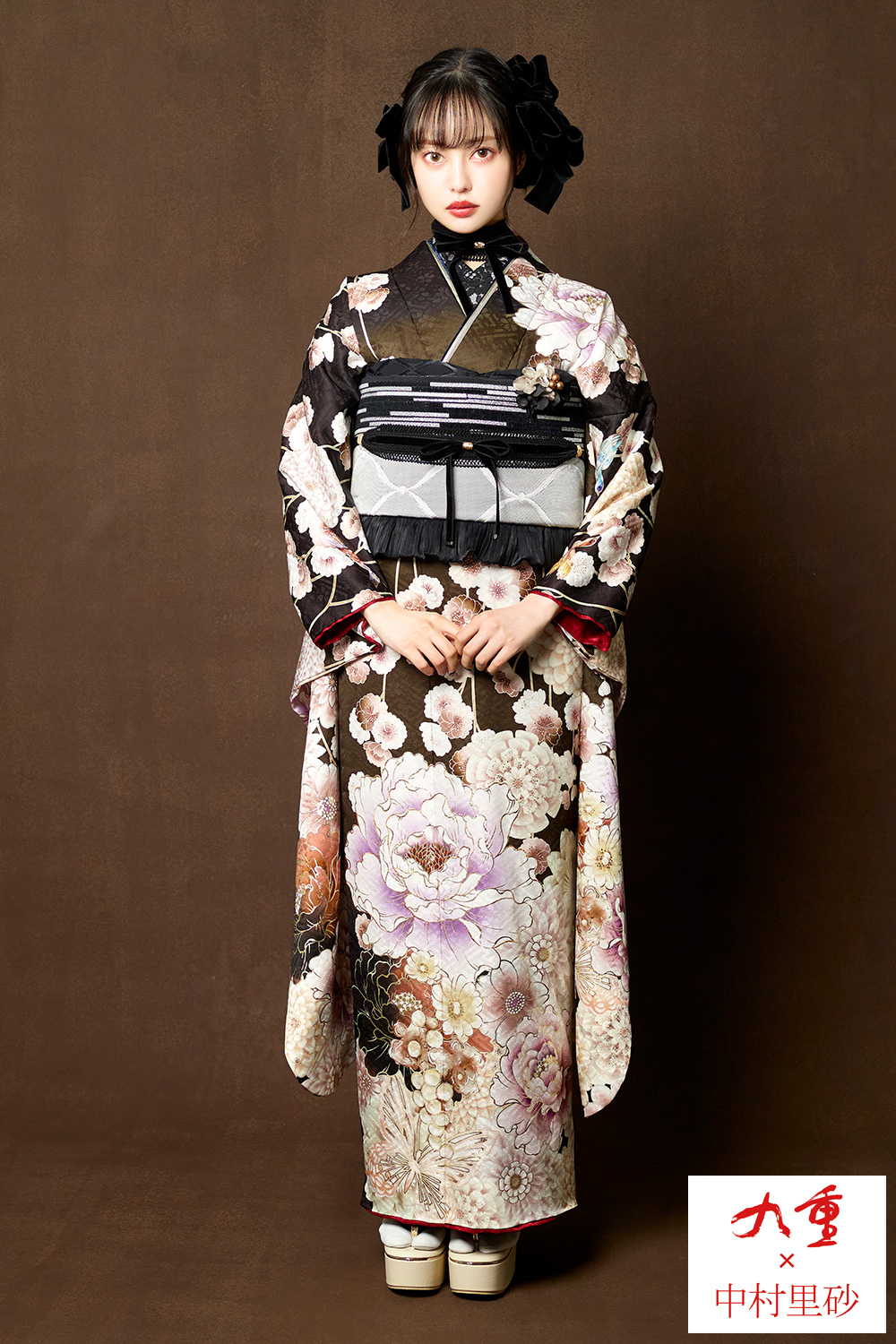 今流行りのくすみカラー、地色は焦げ茶色の振袖で当店でも大人気シリーズです。