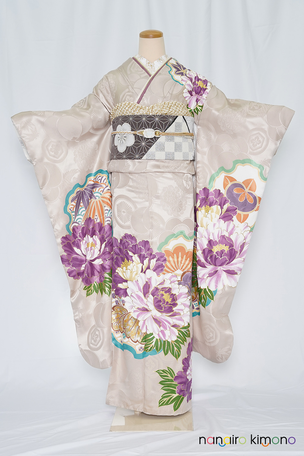 振袖フルセット|グレージュ色 シンプル大柄 F108