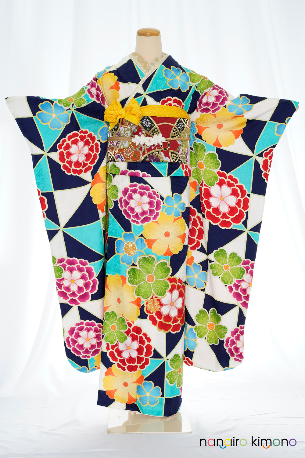 白・紺・水色の三角形の幾何学模様がインパクトのあるレトロモダンな印象の振袖です。赤、黄色、緑、青でかわいいお花が描かれ、かわいくもかっこよくも着こなしていただける一着です。