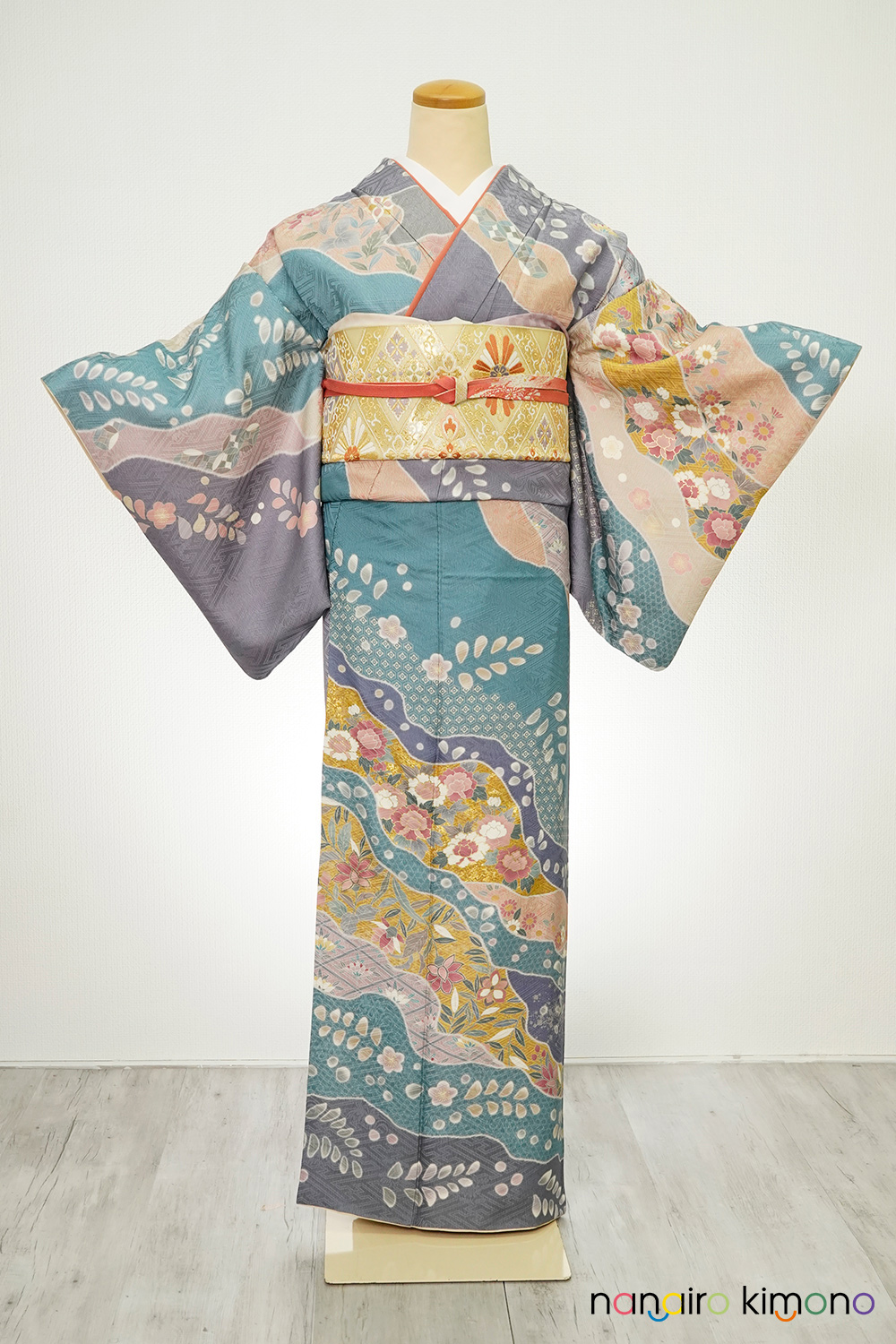 道長取りでブルー、グレー、金、藤色などが配され、花々が散りばめられた個性的な訪問着です。