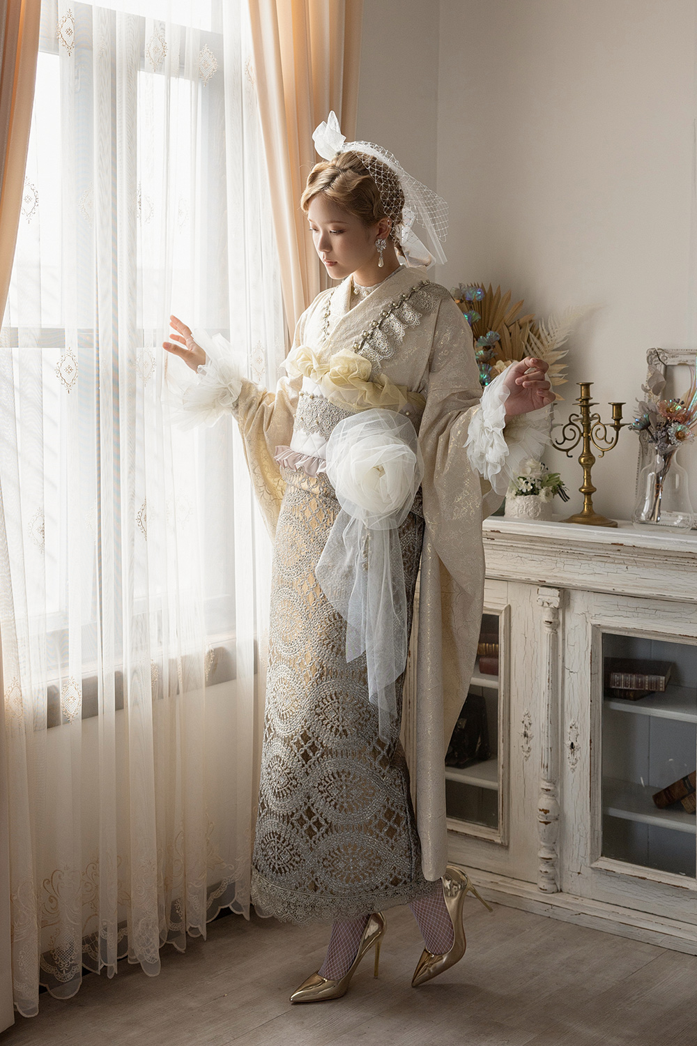 白とキラキラゴールドにチュールやパール、レースなど女の子の好きを詰め込んだお振袖となっております。