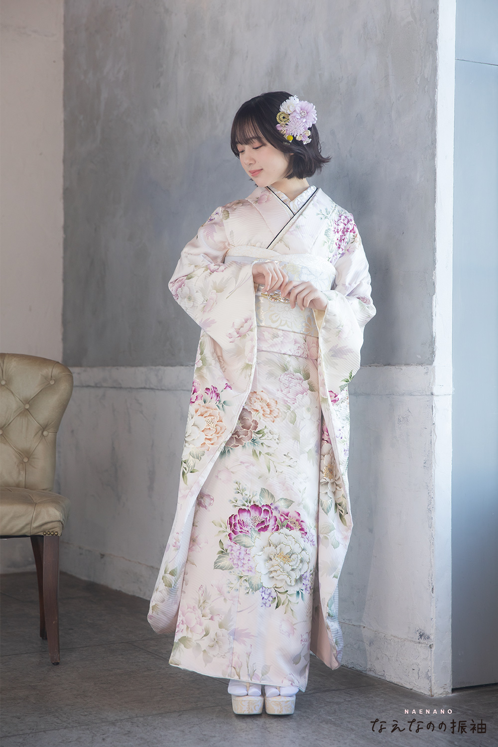 地色は白色で、可愛らしいピンクの花柄が描かれています。透明感たっぷりのシャーベットカラー、ワントーンですっきりまとまる古典柄で、当店大人気の一着です。