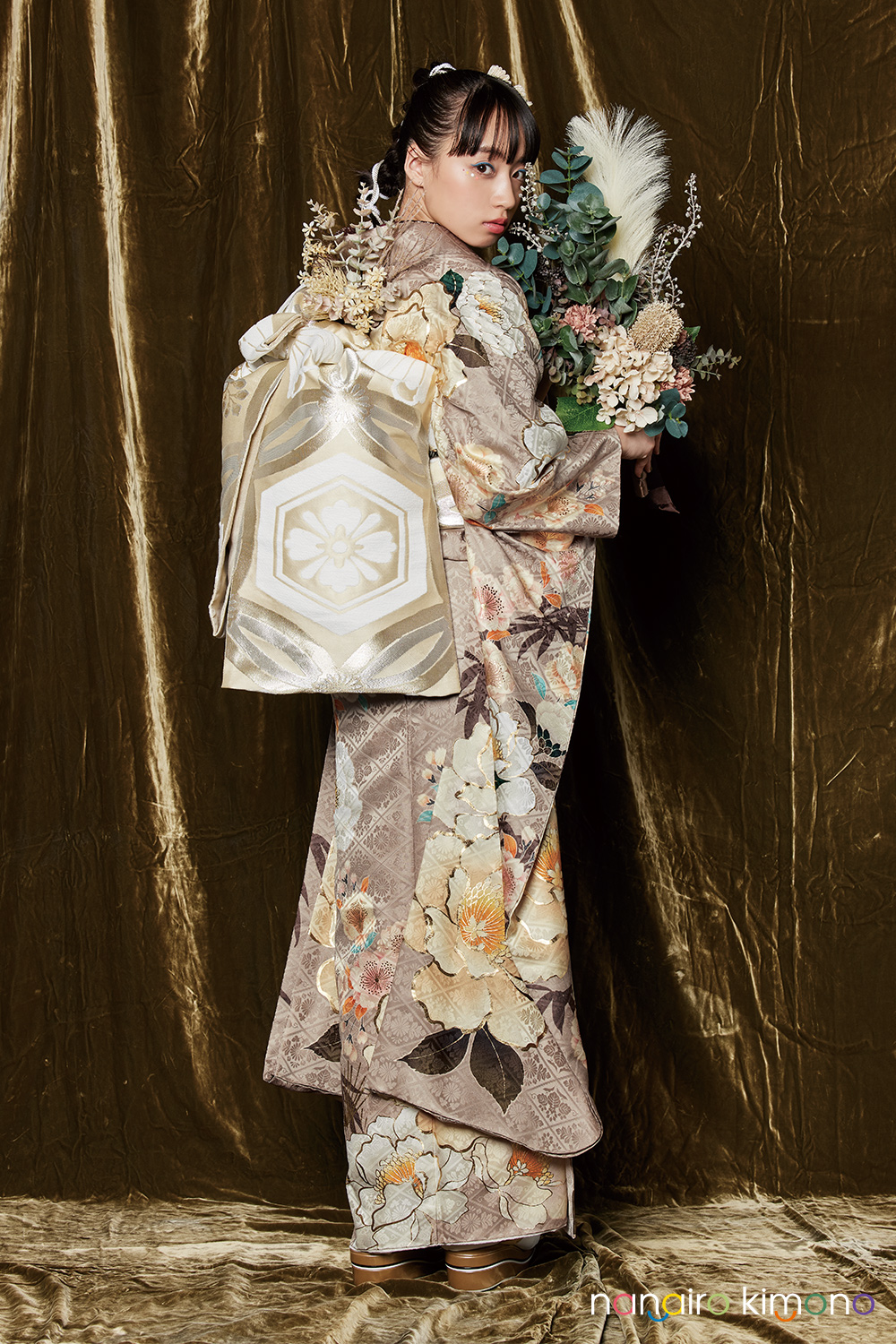 今流行りのベージュ色で、可愛くおしゃれに着こなせる振袖なので、上品に着こなしていただける一着です。