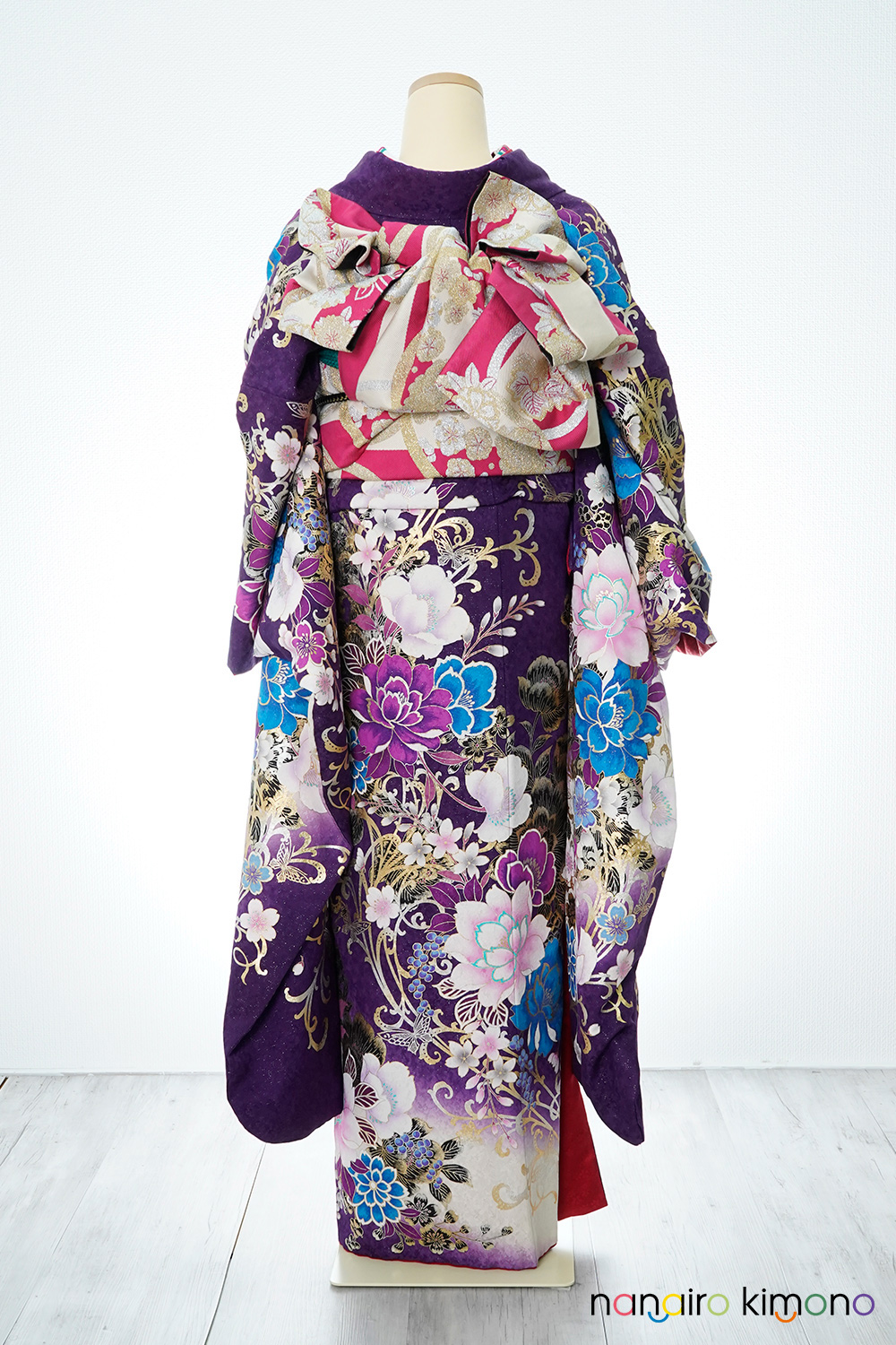 紫色地に白のぼかしが入っています。全体にピンク、水色の牡丹、上前にはスパンコールがあしらわれた牡丹が描かれたスタイリッシュな振袖です。かっこよくもおしゃれにも着こなしていただける一着です。
