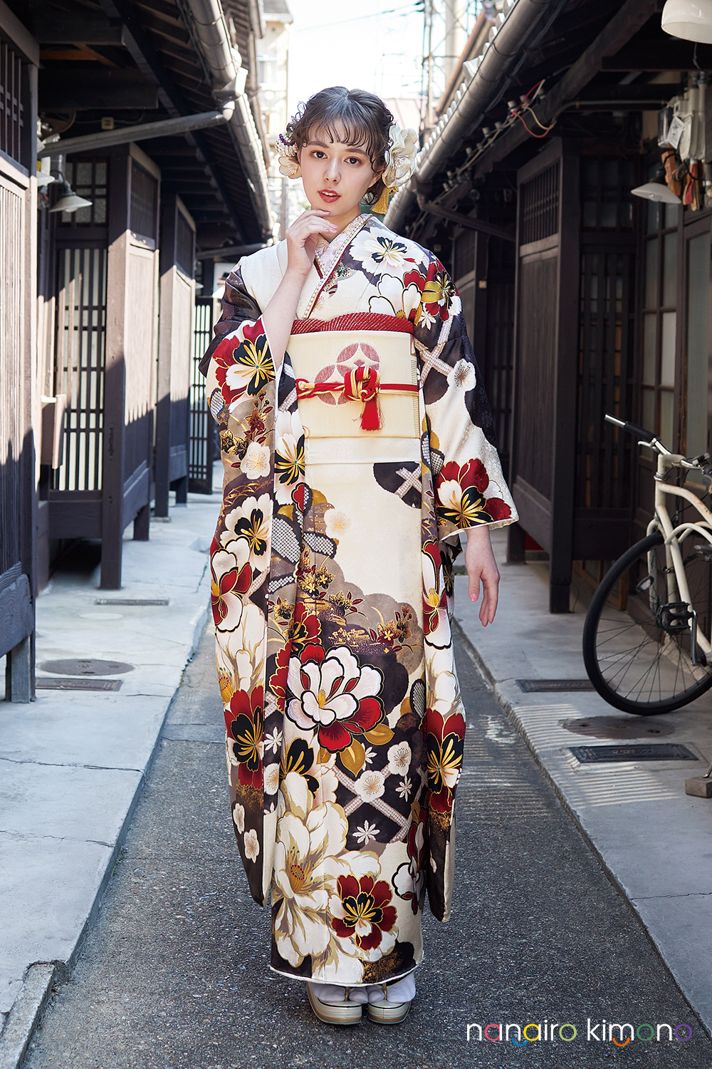 毎年大人気の白色ベースの振袖です。よりモダン風な模様なのでオシャレに可愛く今風にアレンジできるお着物。