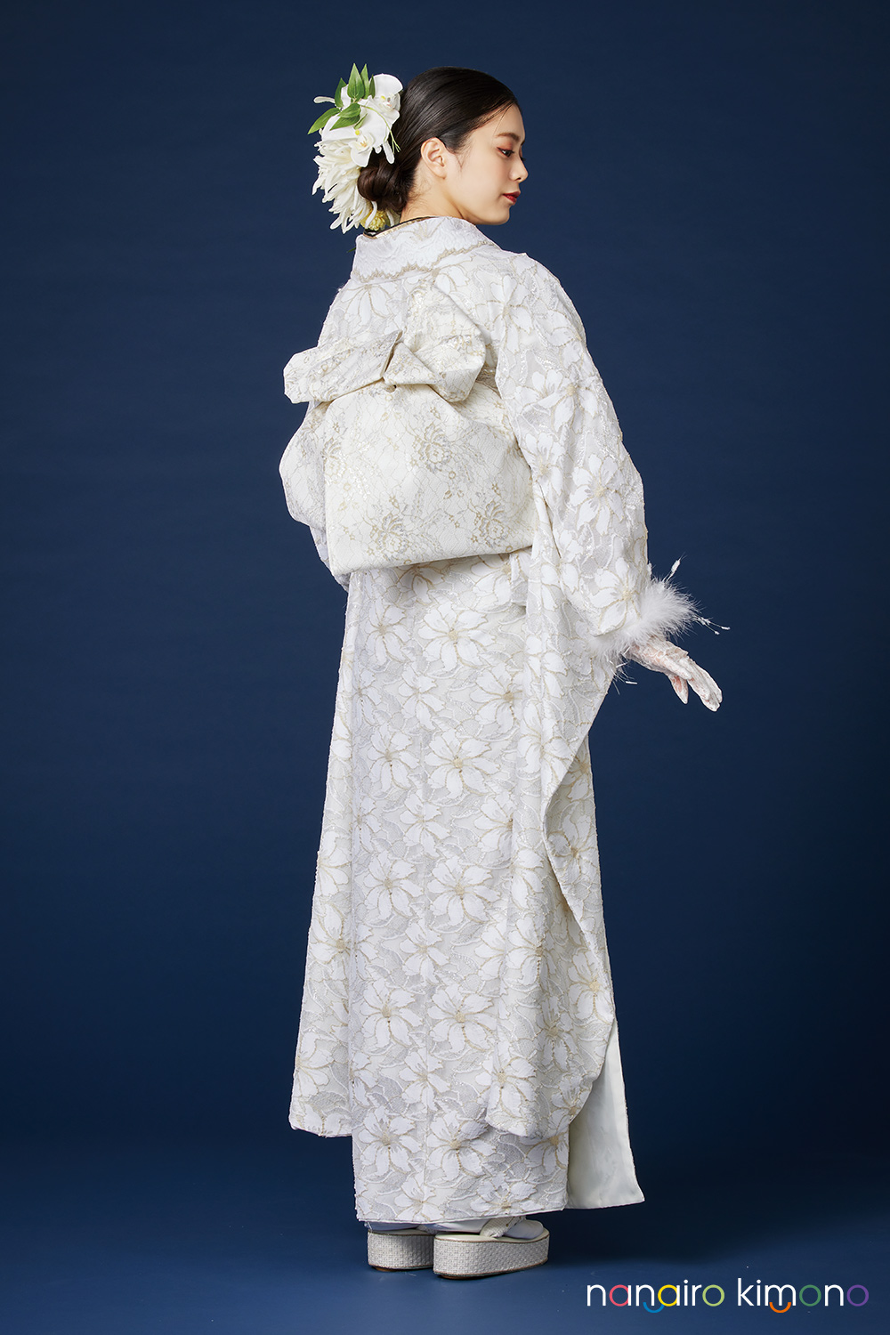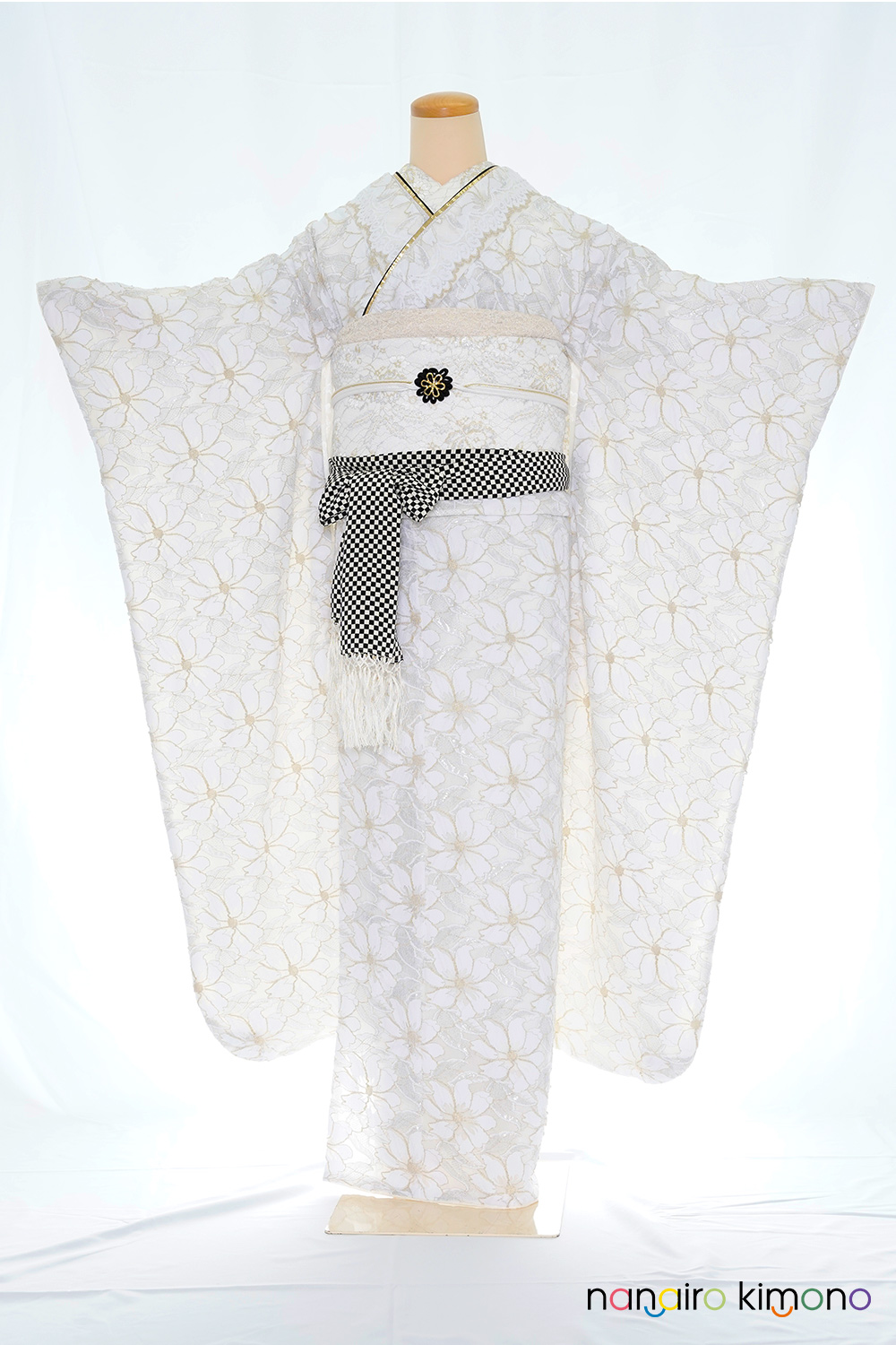 レース生地の着物に、あえてレースの帯や刺繍襟をつけて更にお洒落に豪華な振袖です。