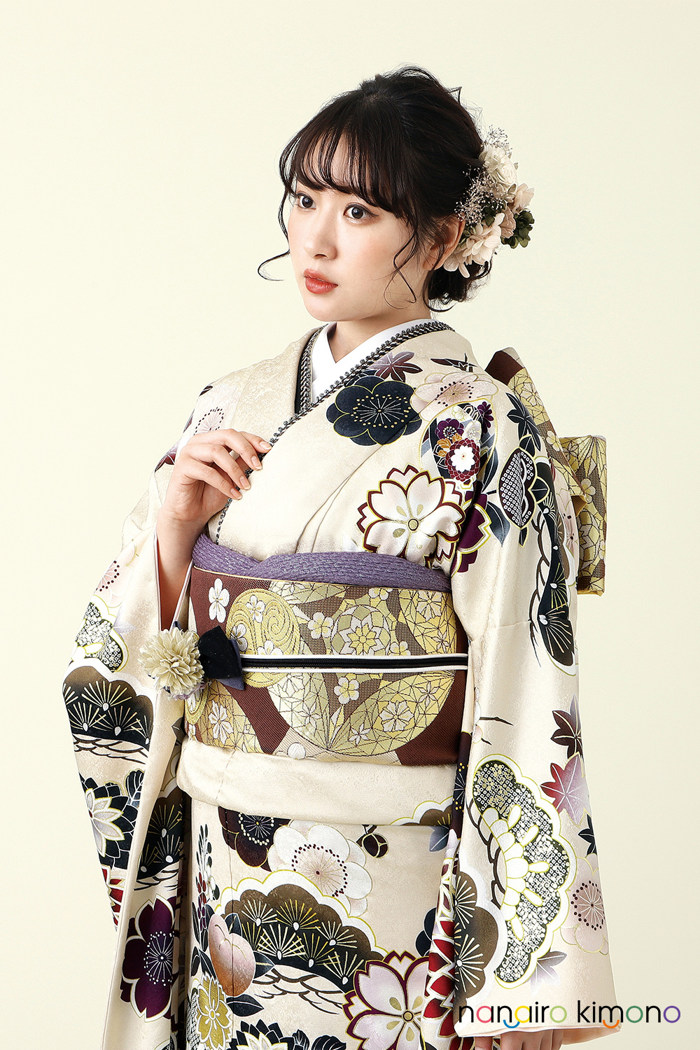 白色地の上品で華やかな品のある古典模様のおすすめの振袖です。定番な古典柄ですが、今風の華やかなデザインなので目を引くこと間違いなしです。上品に着こなしていただける一着です。
