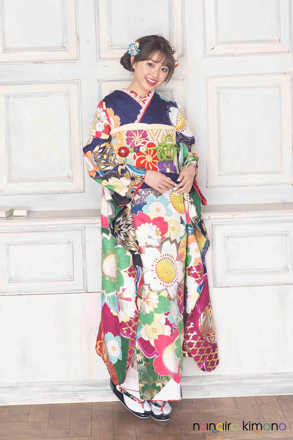 紫色地にカラフルな桜と鞠の柄が印象的なポップで可愛い振袖です。左右の裏表で柄が互い違いになっている珍しいお着物です。目を引くこと間違いなしの一着です。