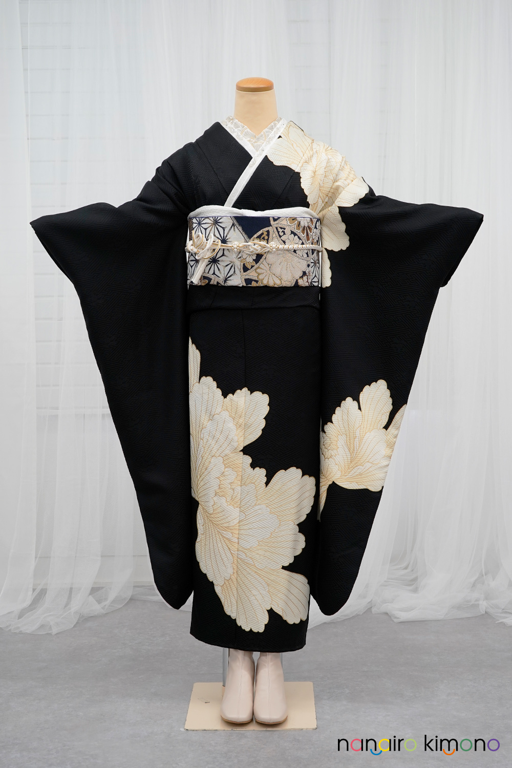 黒色地の今流行りのシンプル着物で、おすすめの振袖です。シンプルなデザインですが、小物で豪華にしてカッコよく着こなしでいただけます。