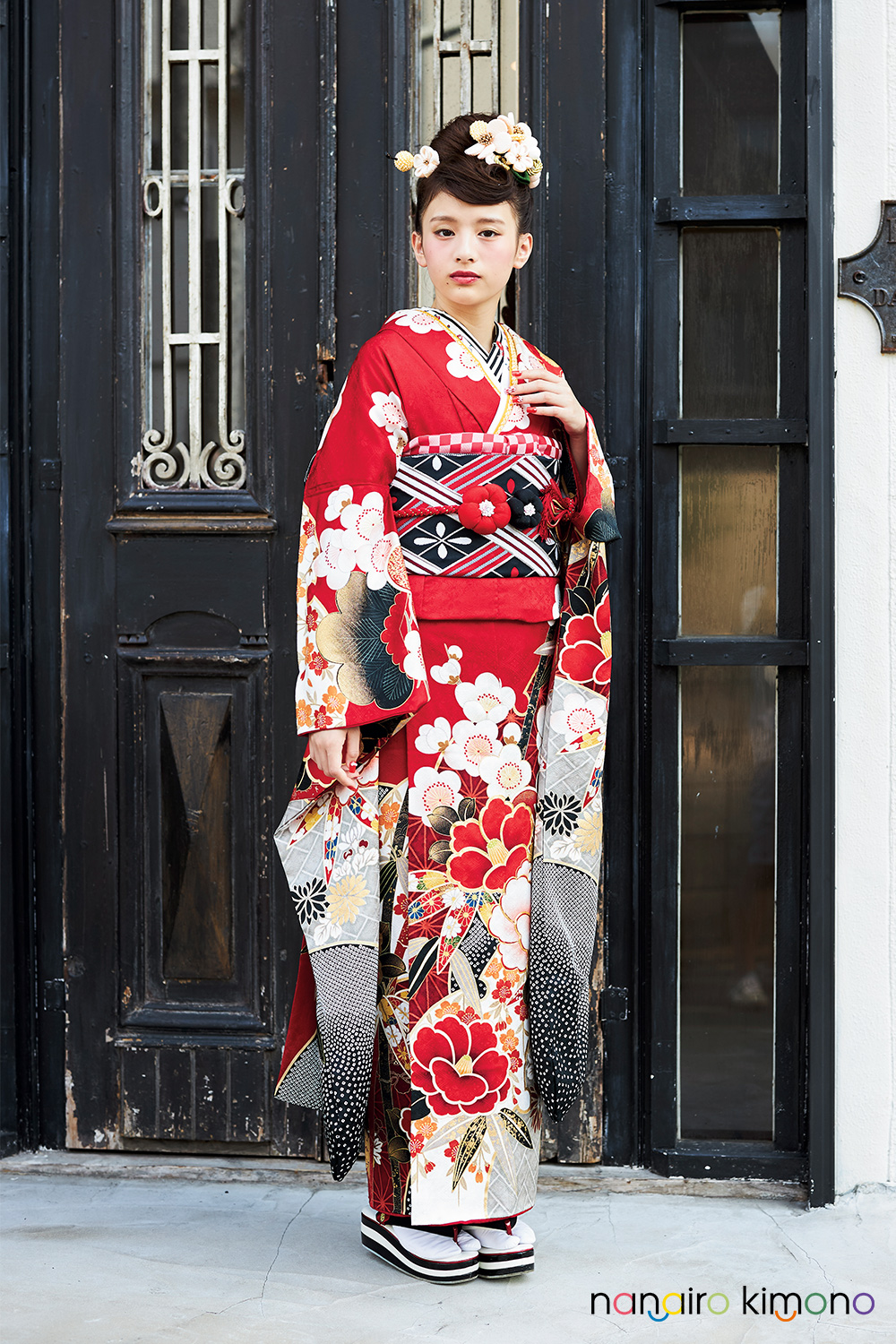 振袖フルセット|赤色 かわいい椿柄 F063