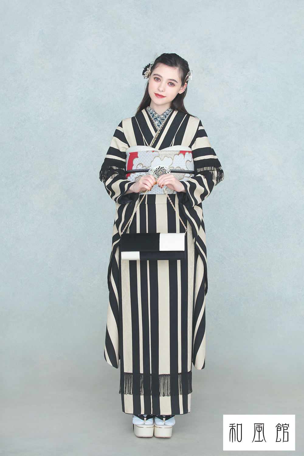 鮮やかな黄色時にピンク色の立涌模様がレトロさを感じさせる振袖です。オレンジ色と黄緑色の大きな桜の花がインパクトがあり、かっこよくもかわいくも着こなしていただける一着です。
