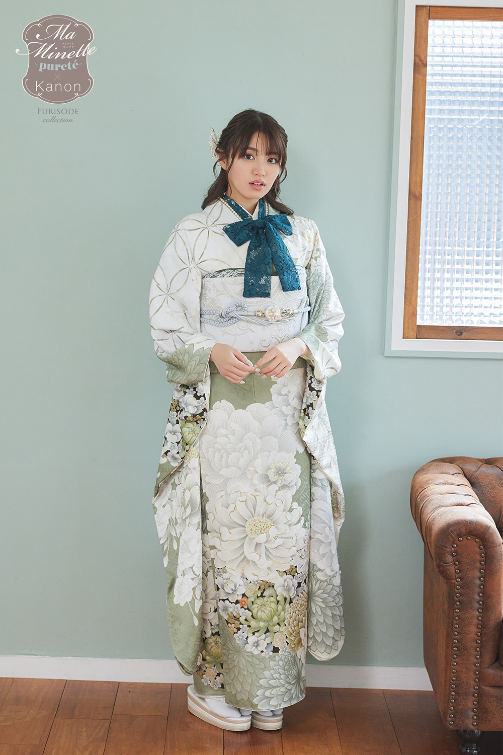 香音プロデュースの振袖です。地色は珍しい淡いグリーン色のお着物です。