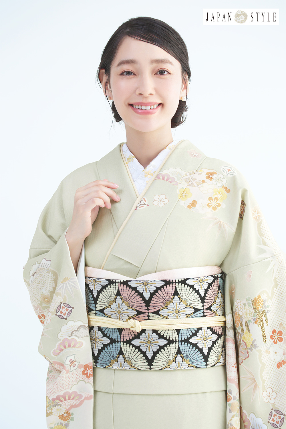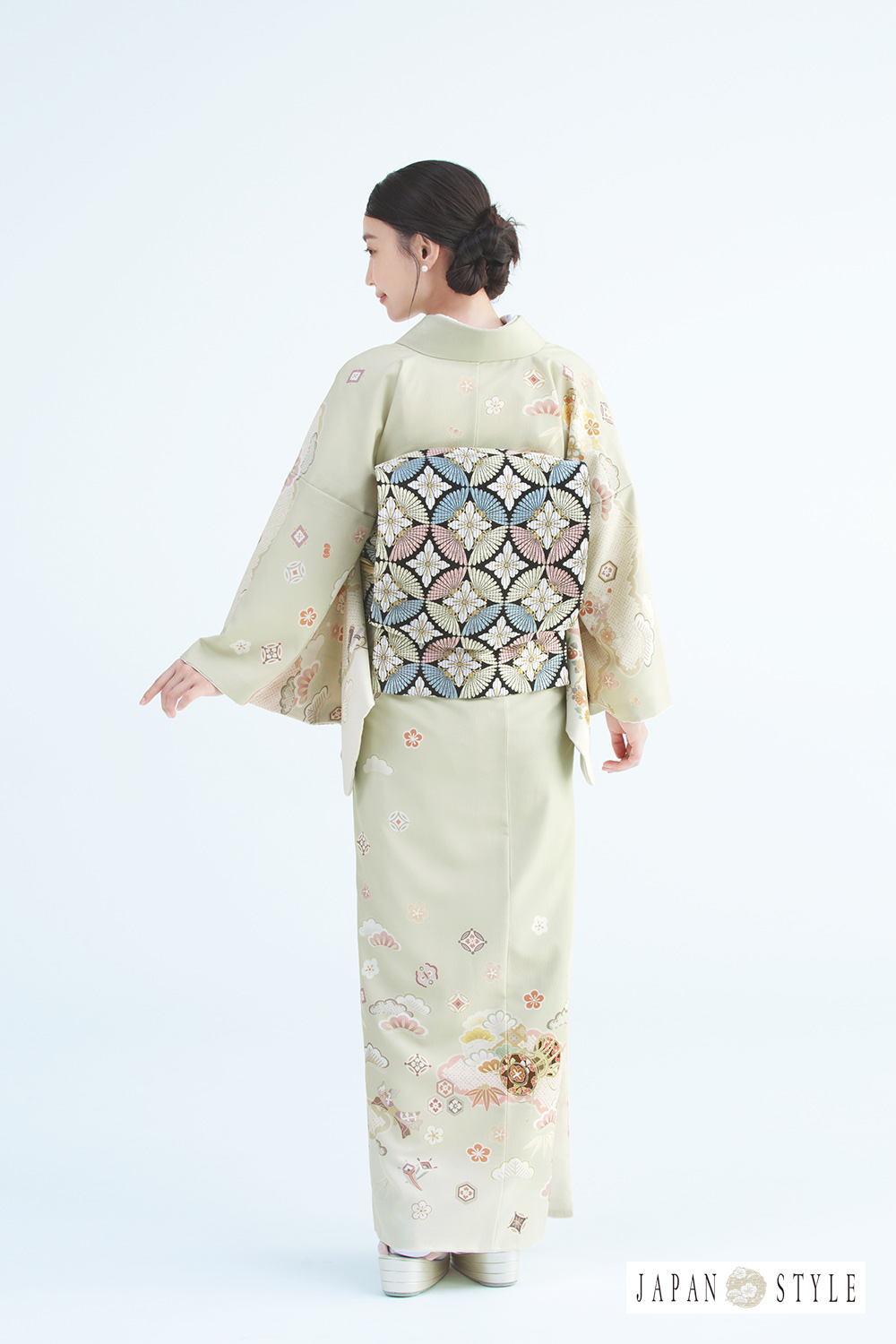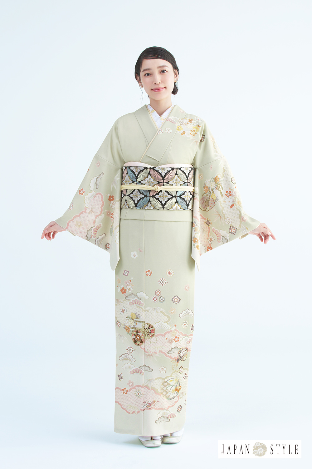 淡い緑色の柔らかい色合いなので、上品な着物です。