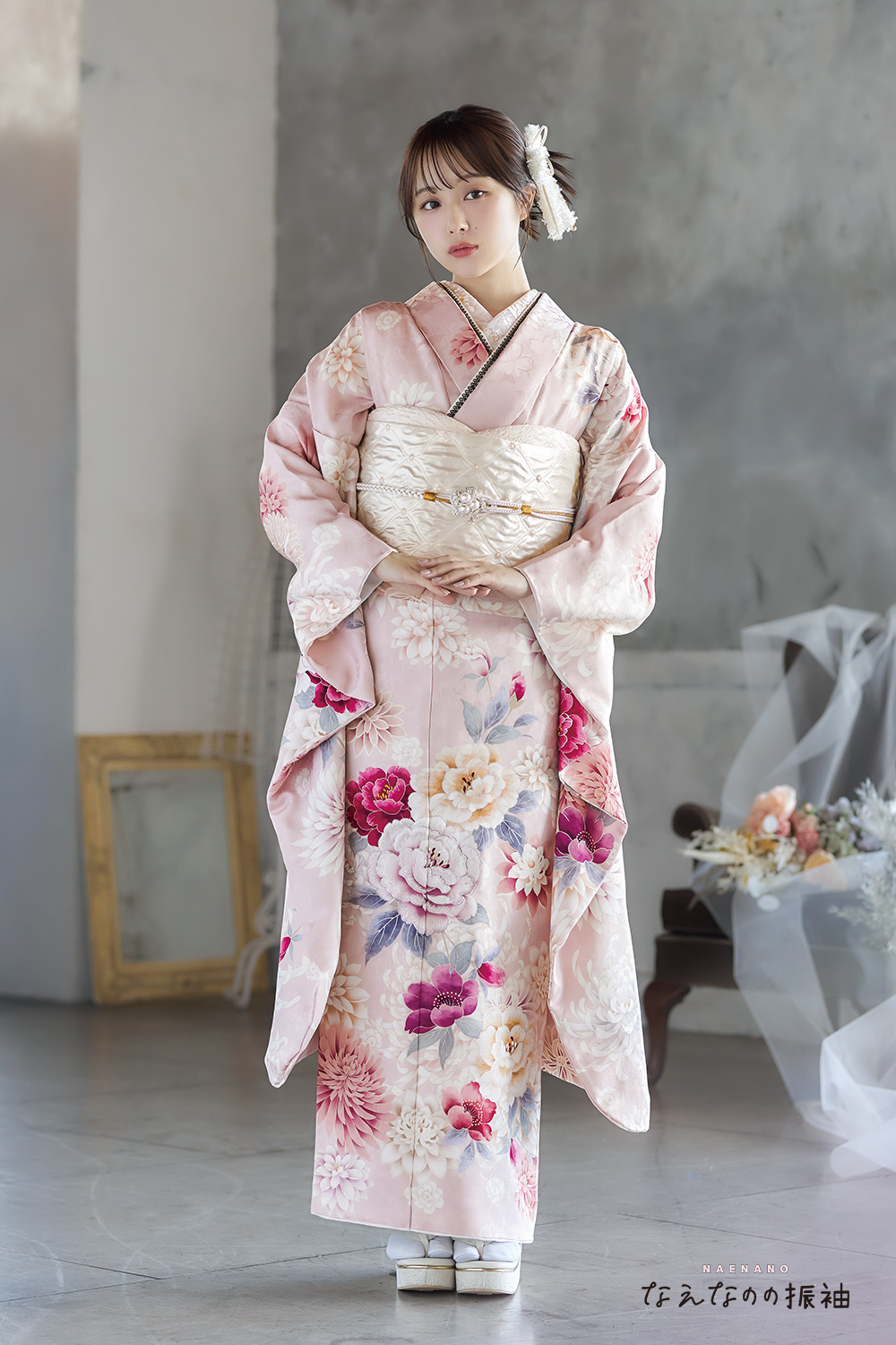 透明感たっぷりのシャーベットカラー、ワントーンですっきりまとまる洋花柄で、当店大人気の一着です。