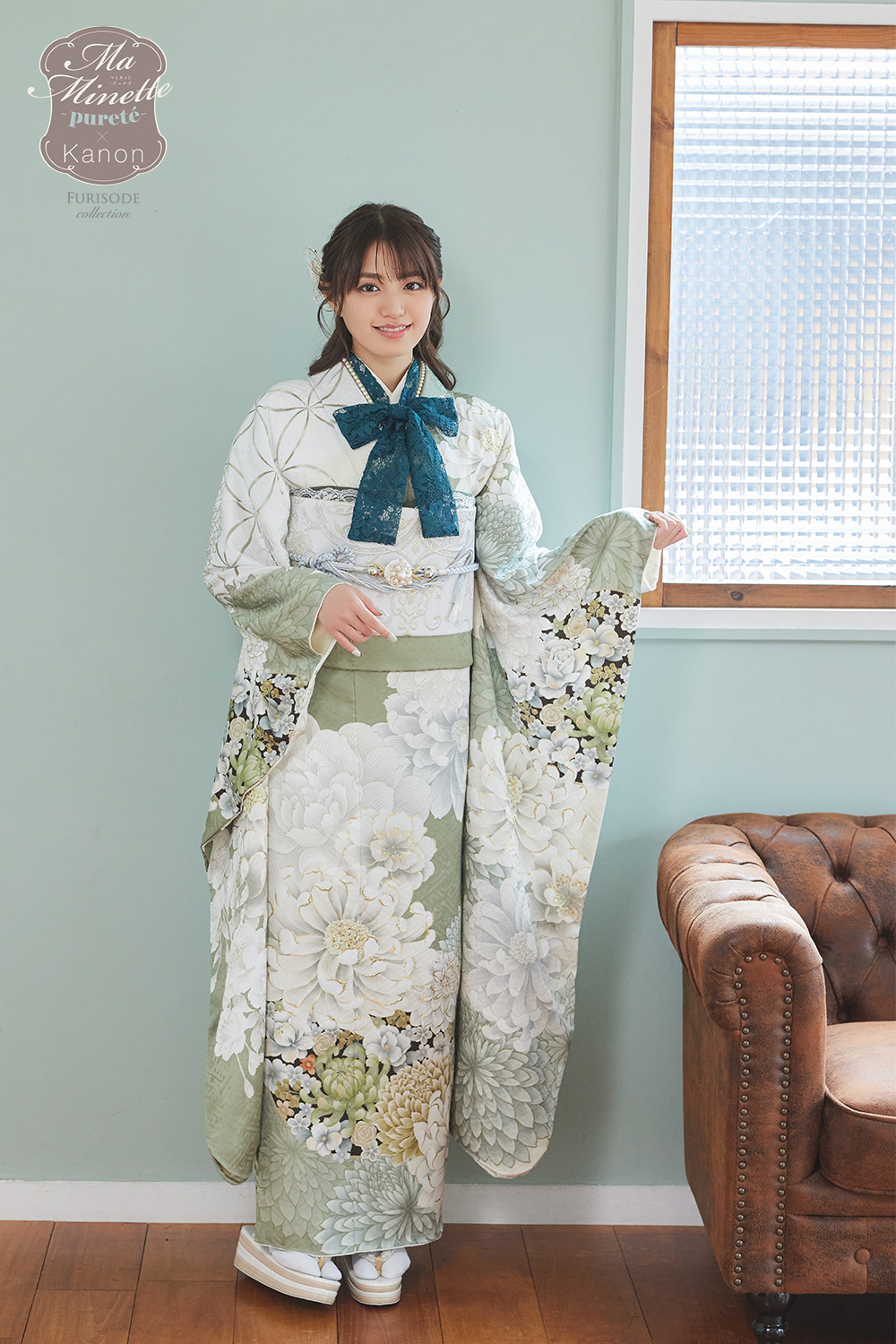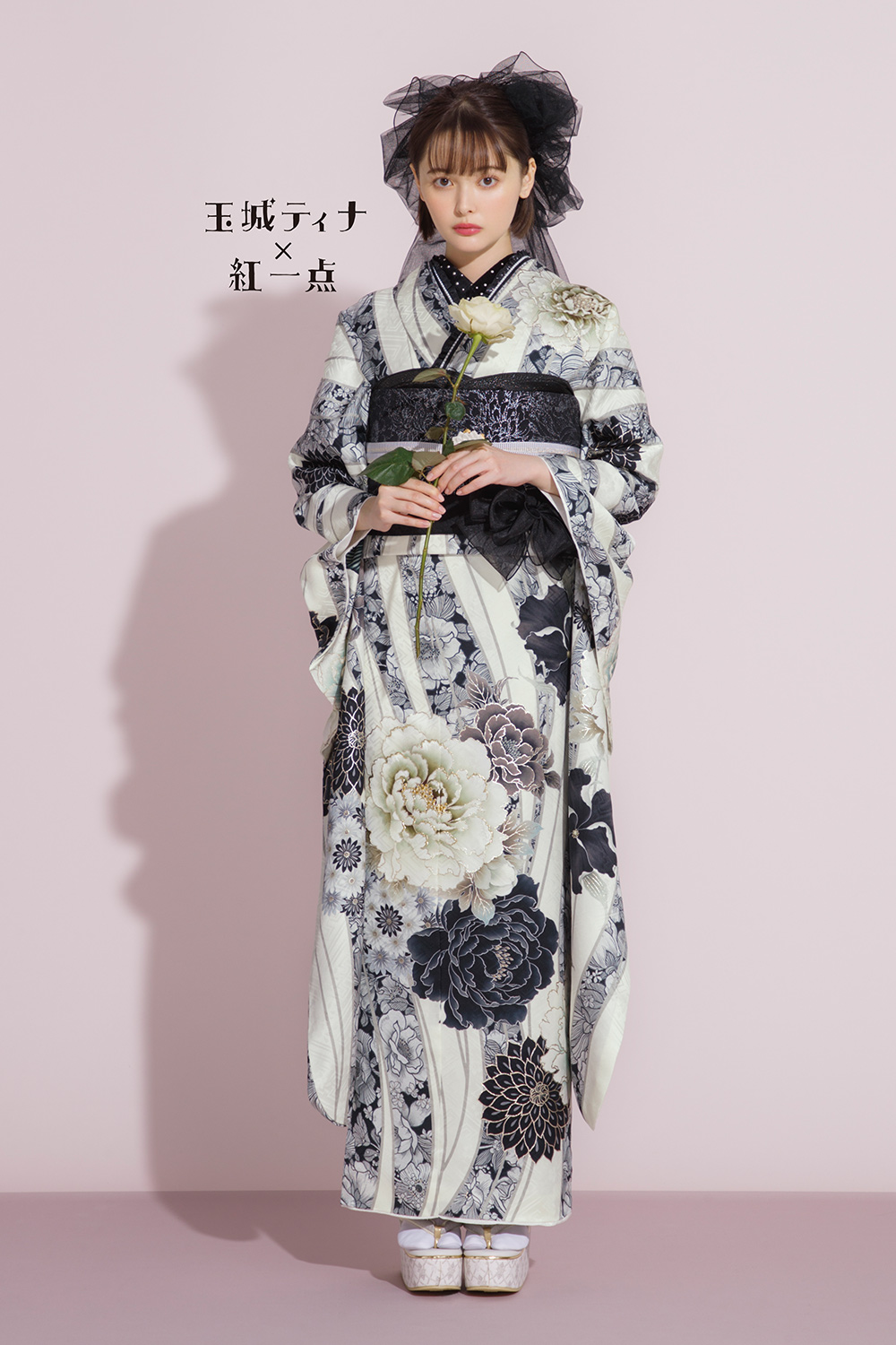 白とピンクの大きな牡丹と華リボンが印象的で上品にも着こなしていただける一着です。