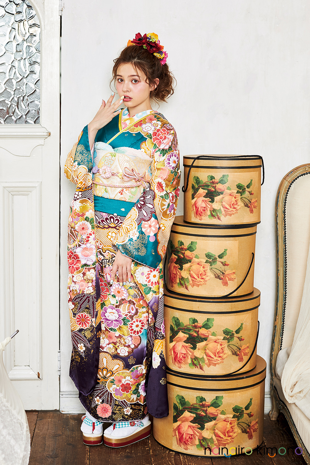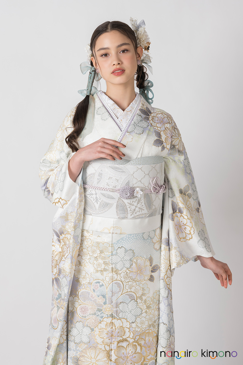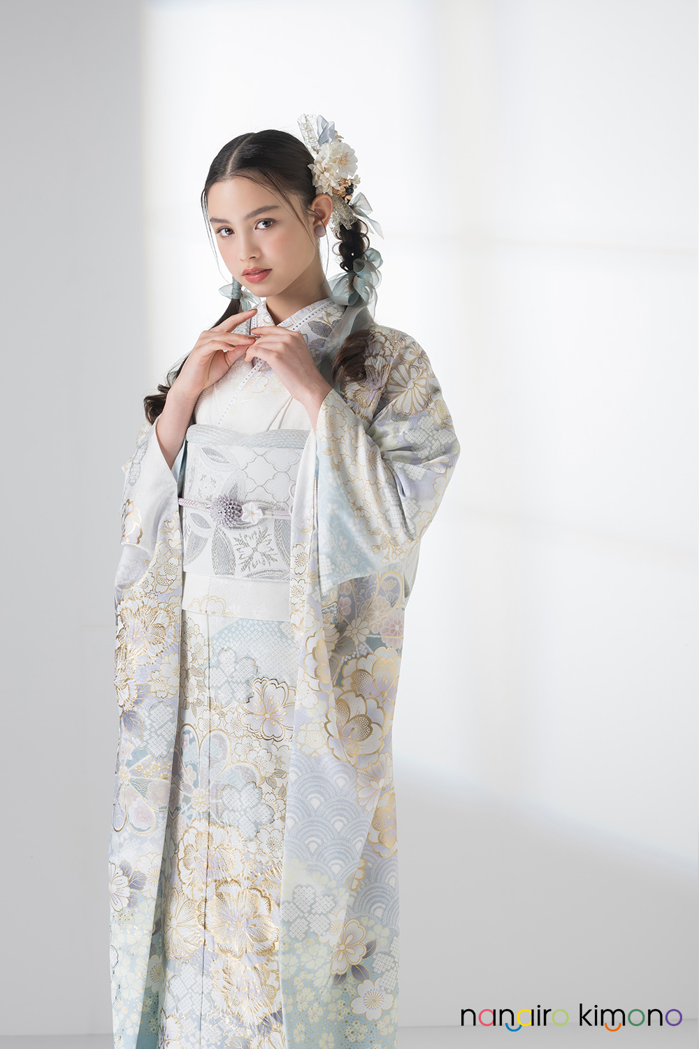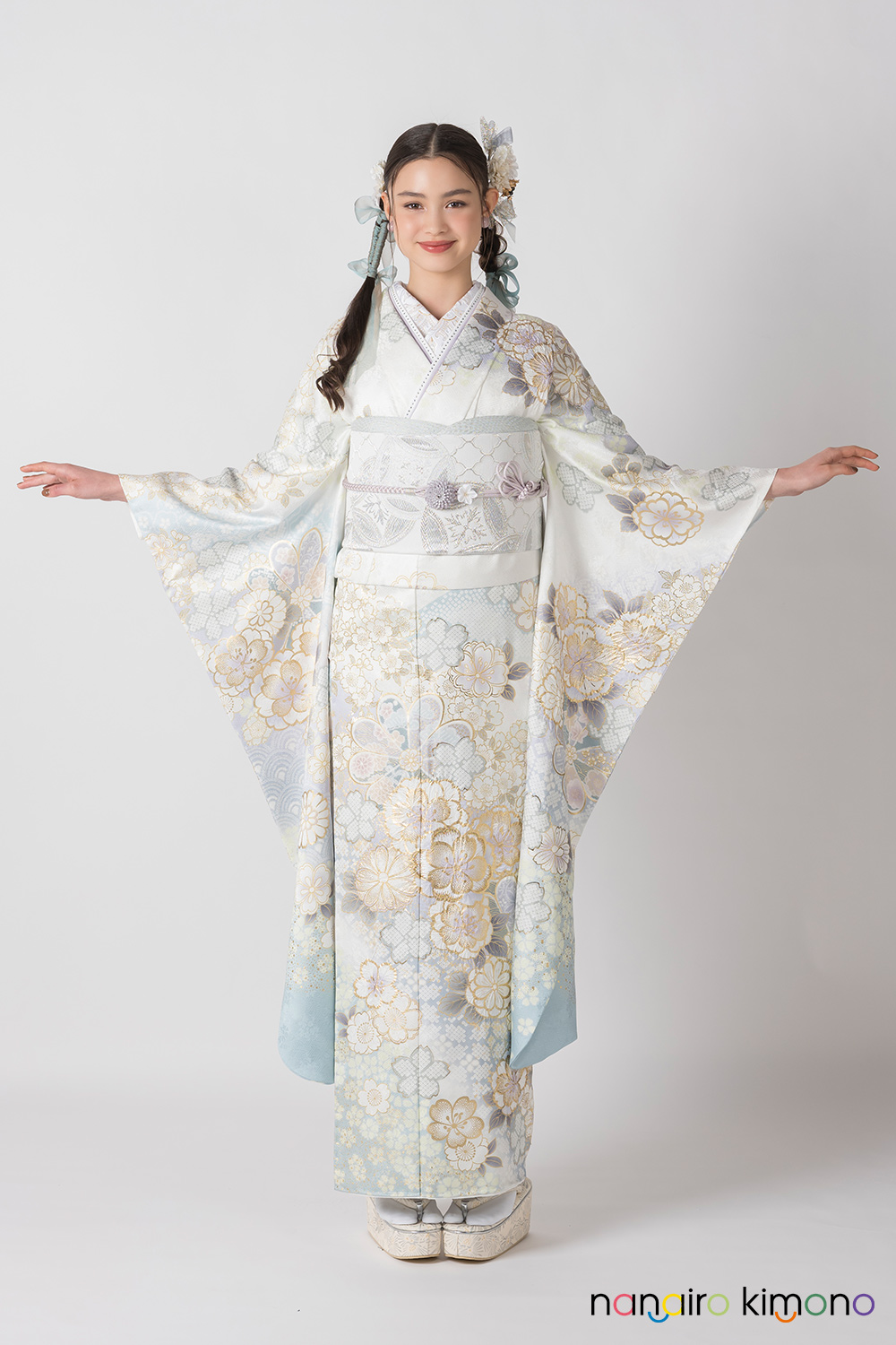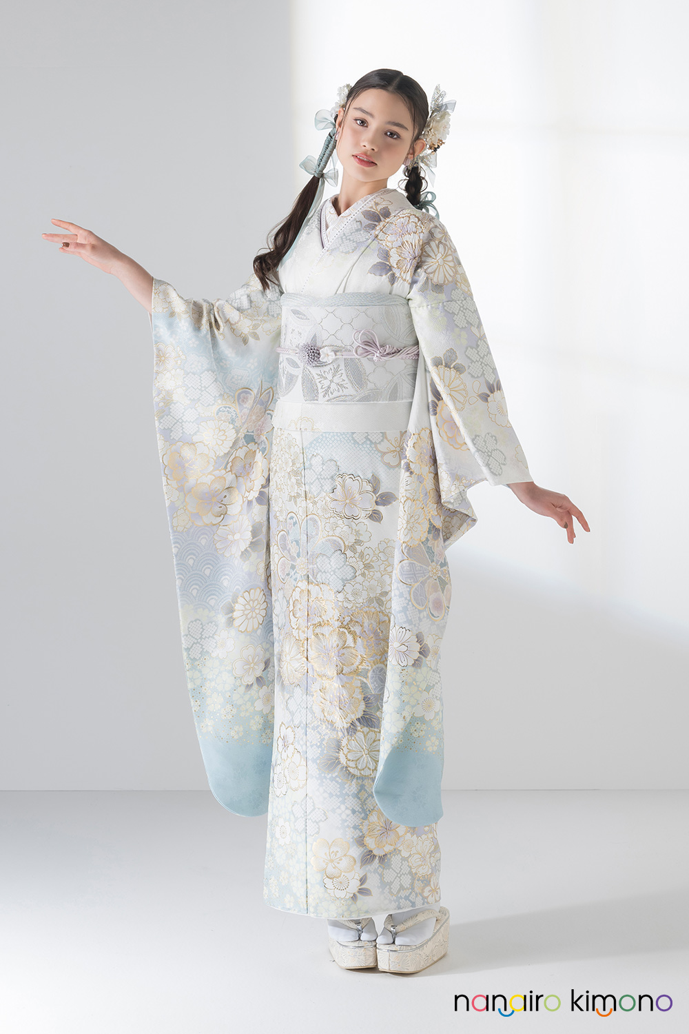 白色地の淡い水色のお振袖は今流行りのシンプル着物で、おすすめの振袖です。