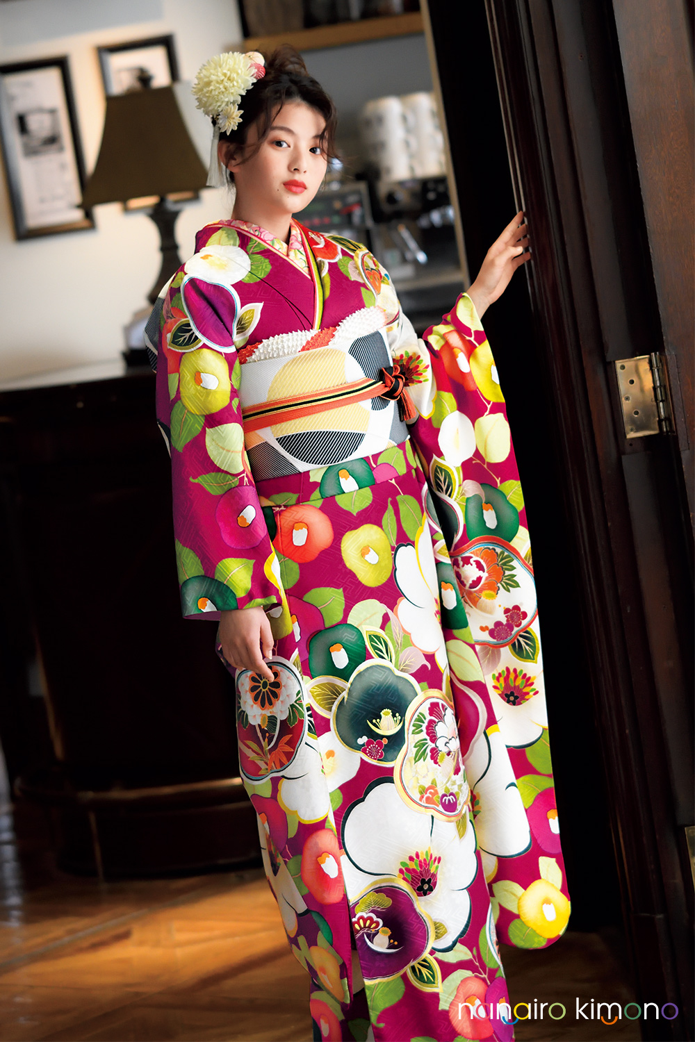 赤紫色地に牡丹が描かれたレトロな雰囲気の振袖です。珍しい赤紫色の振袖、可愛く着こなしていただけすこと間違いなしの一着です。