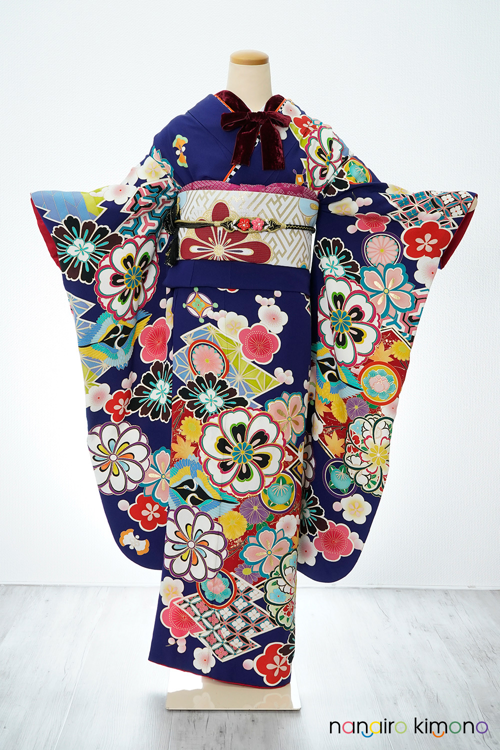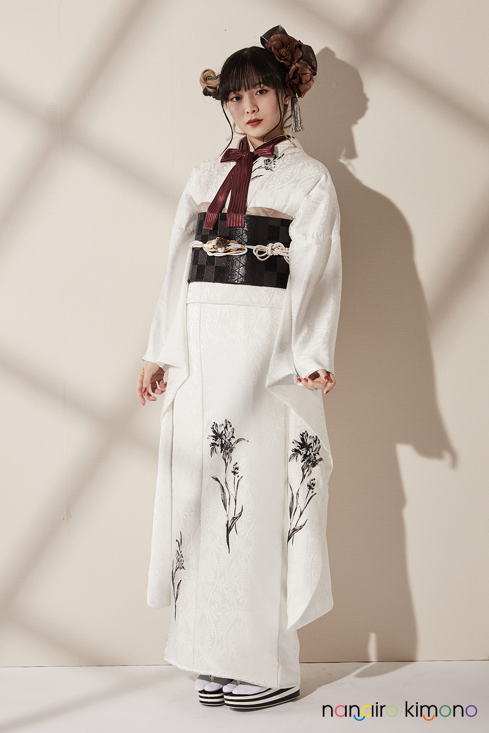今流行りのくすみカラー、地色は焦げ茶色の振袖で当店でも大人気シリーズです。