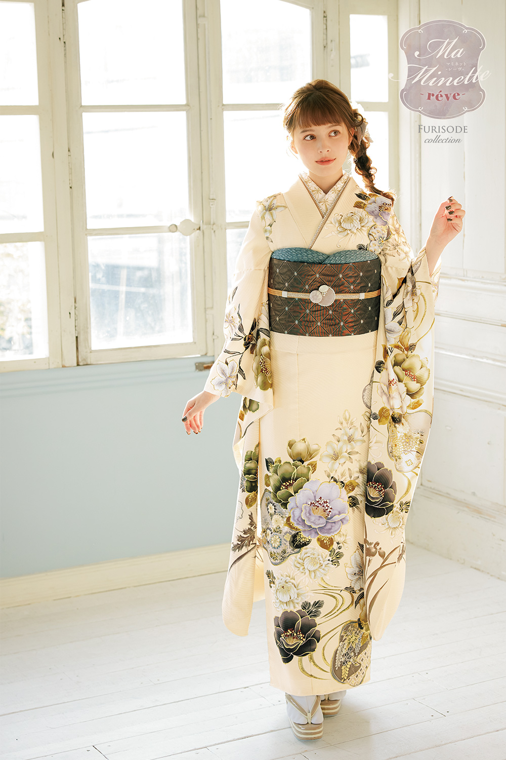 今田美桜プロデュースの派手で可愛い、おすすめの振袖です。ちりめんの鮮やかな緑地に桜の花の生地文様が織り込まれています。大小様々な桜がと所々に描かれた市松模様が印象的で、可愛くもスタイリッシュにも着こなしていただける一着です。