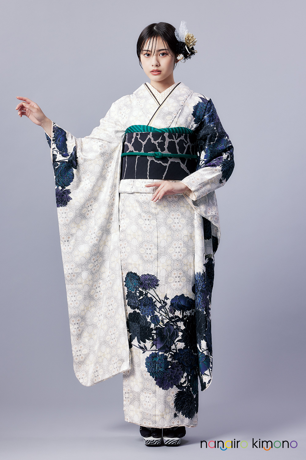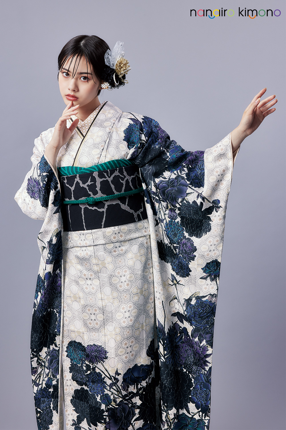 斉藤上太郎(JOTARO SAITO)プロデュースの着物です。何よりも珍しいのが、お花の柄色が紺色一色な事です。今までにはない振袖のスタイルで、ヴィンテージ×カッコイイ、誰とも被らない1着です。