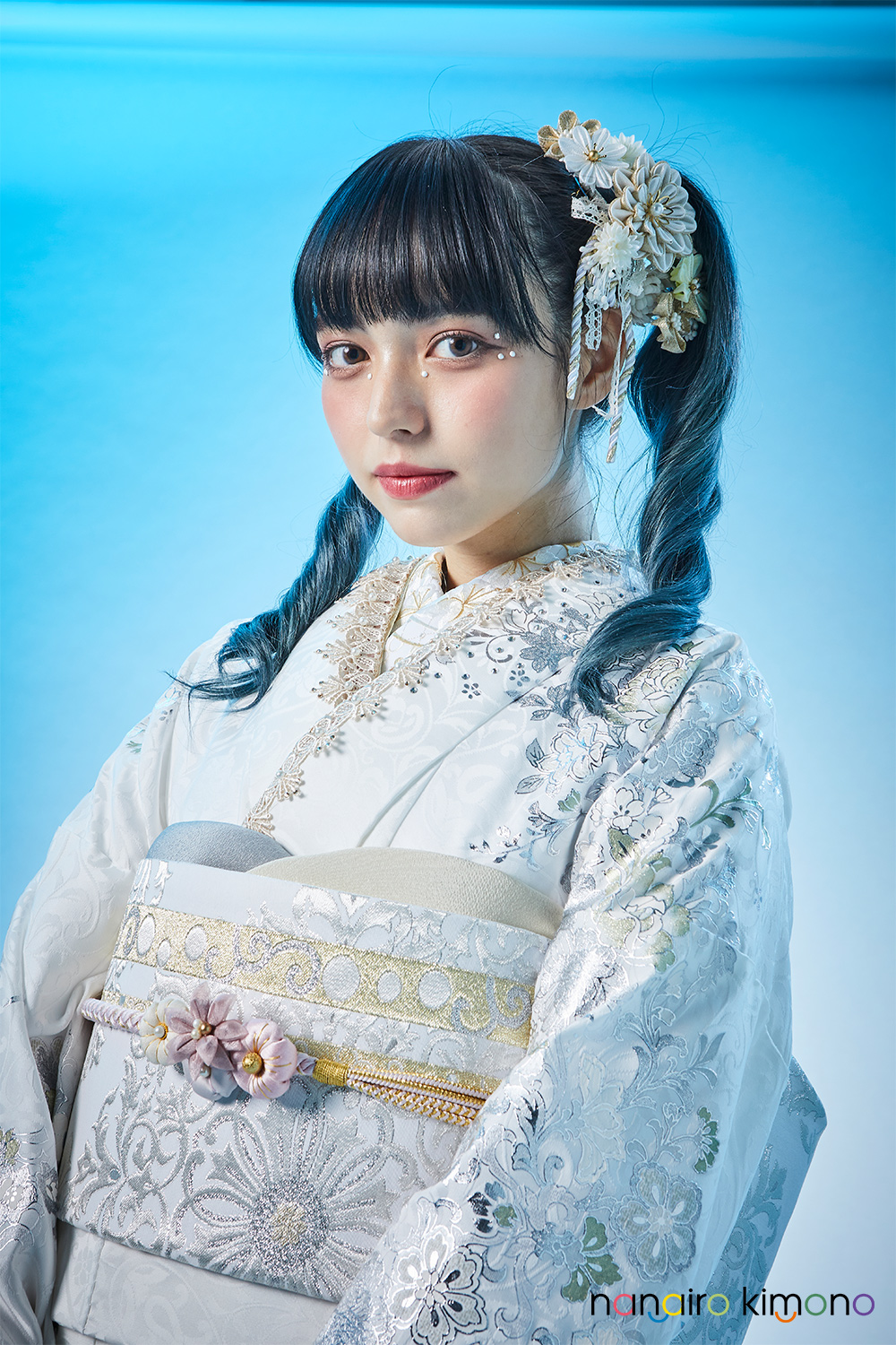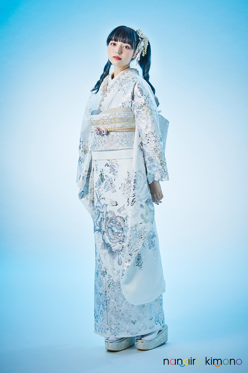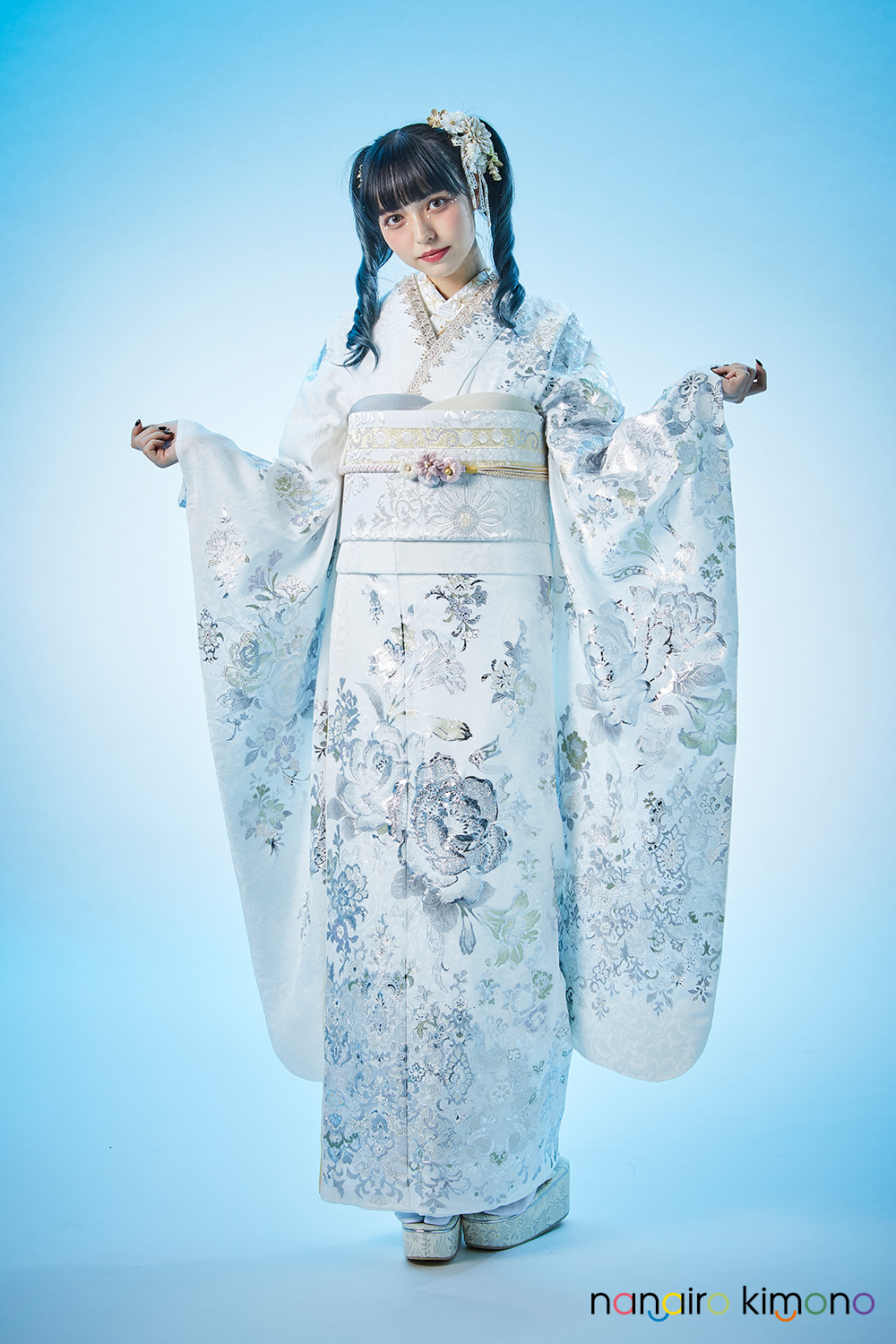 白色地の今流行りのシンプル着物で、おすすめの振袖です。シンプルなデザインですが、小物で豪華にしてカッコよく着こなしでいただけます。