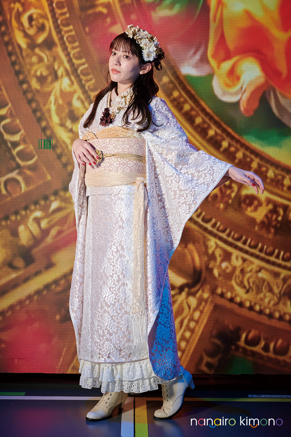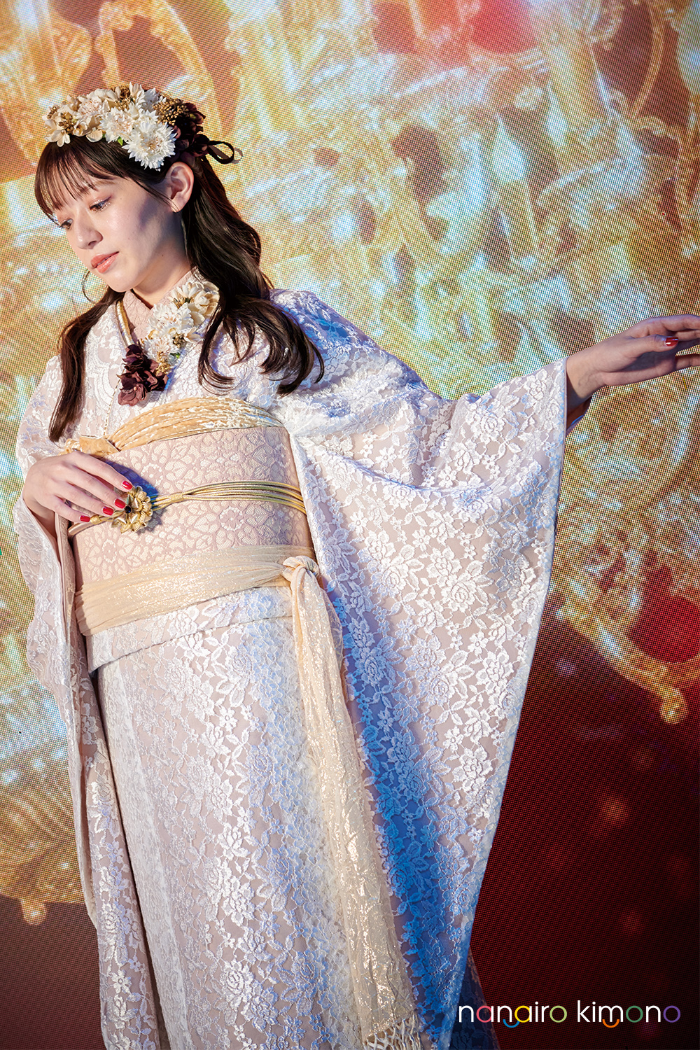 レース生地の着物に、あえてレースの帯や刺繍襟をつけて更にお洒落に豪華な振袖です。