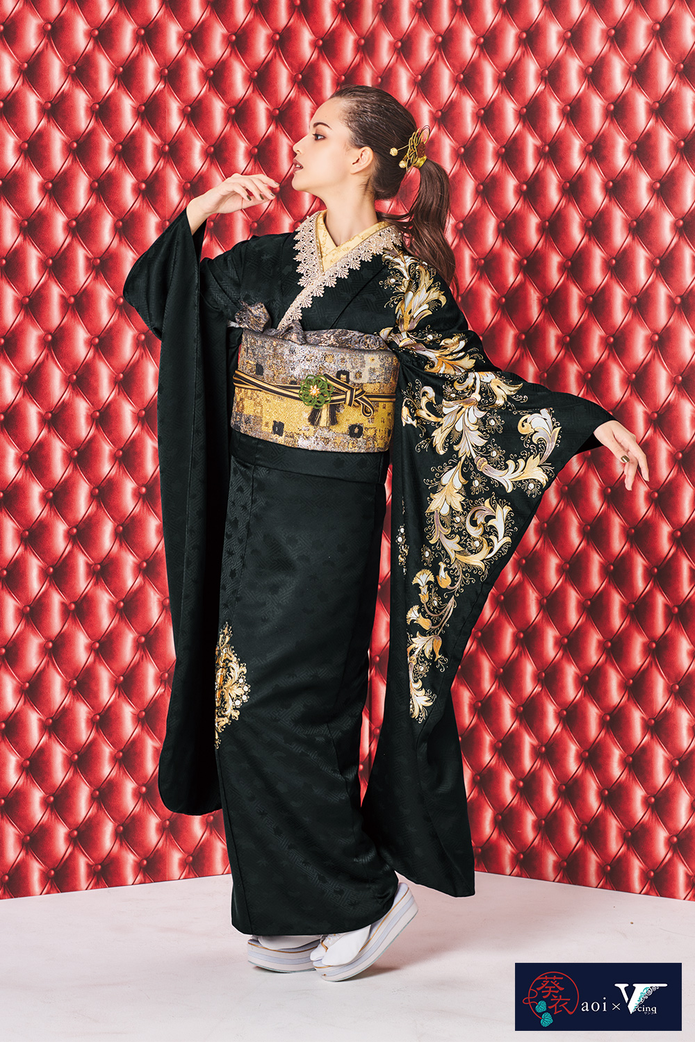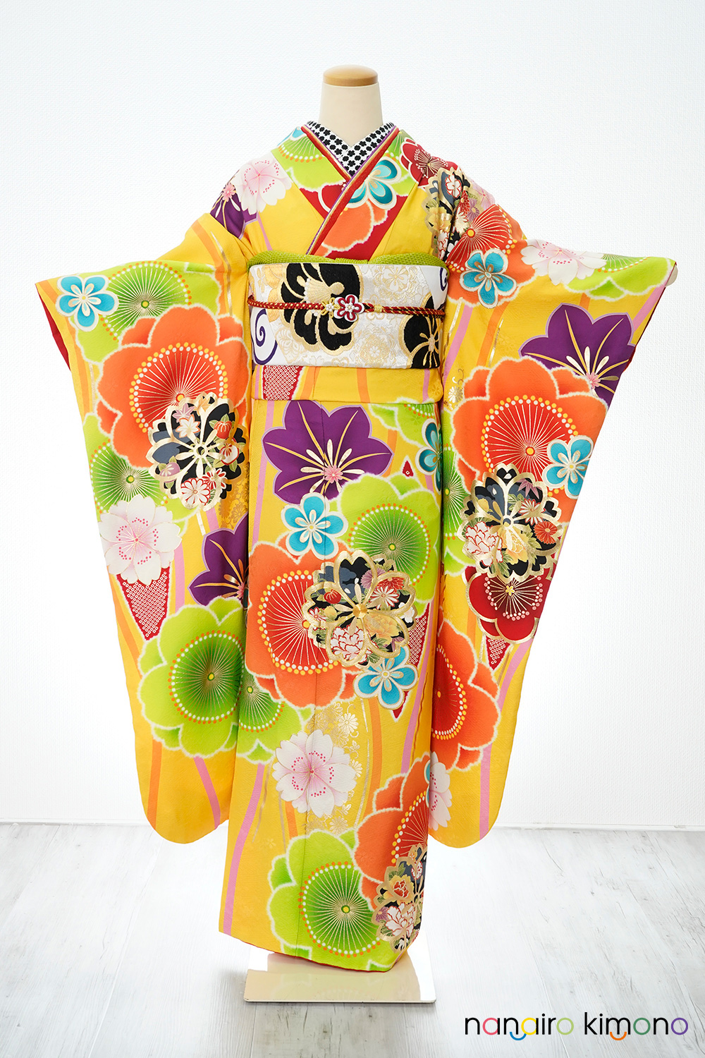 白・紺・水色の三角形の幾何学模様がインパクトのあるレトロモダンな印象の振袖です。赤、黄色、緑、青でかわいいお花が描かれ、かわいくもかっこよくも着こなしていただける一着です。