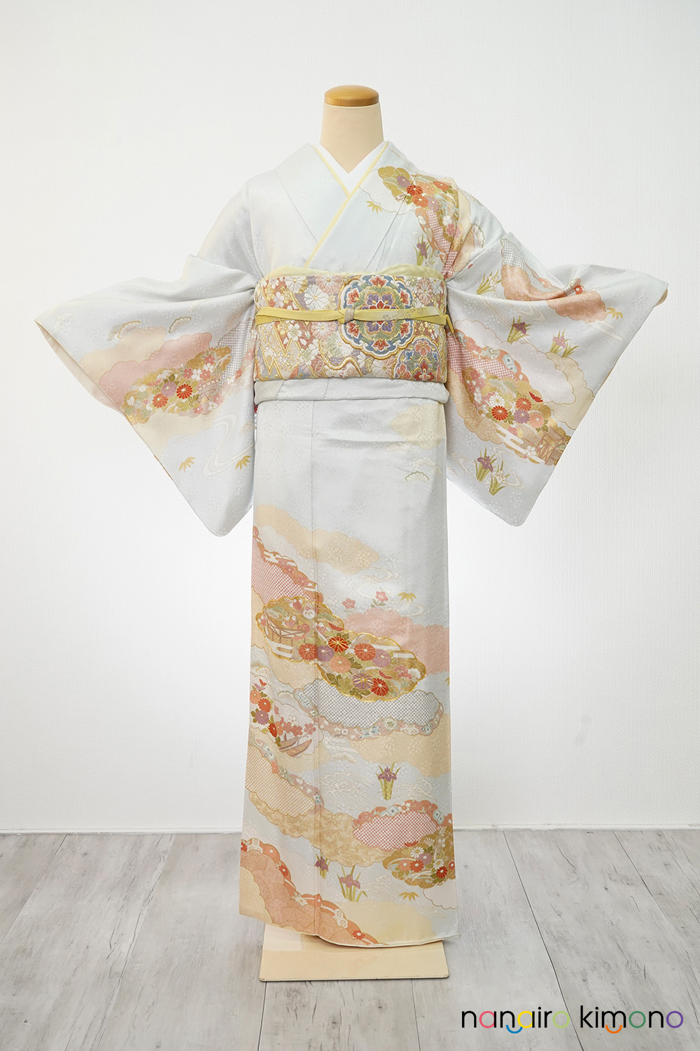 道長取りでブルー、グレー、金、藤色などが配され、花々が散りばめられた個性的な訪問着です。