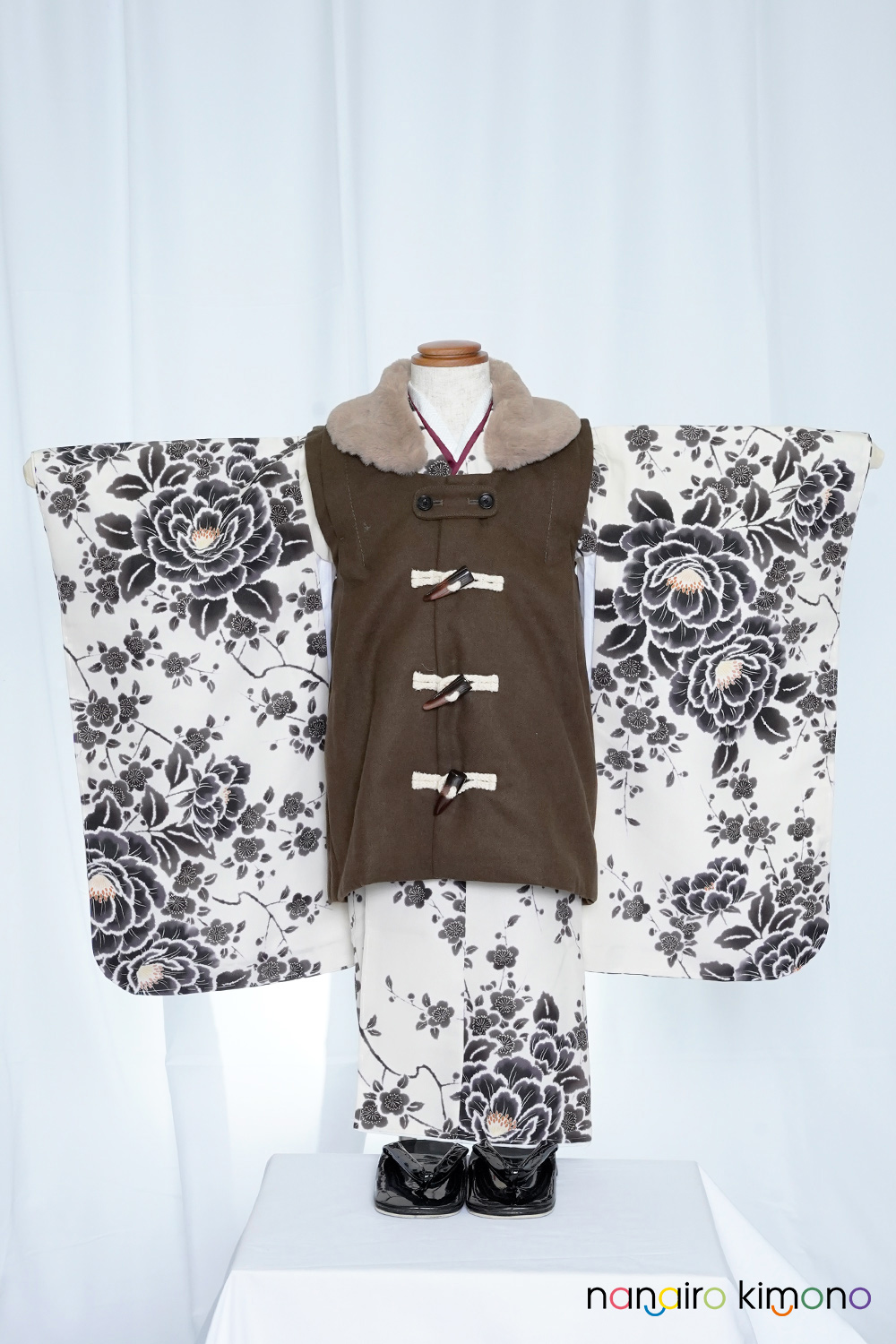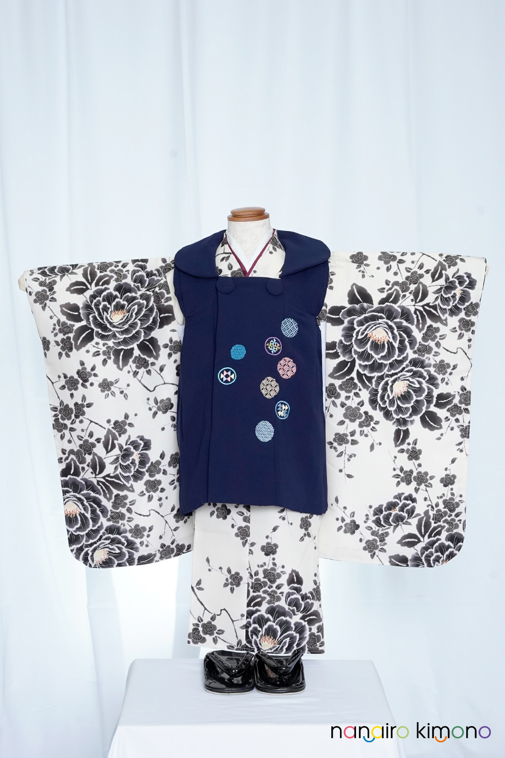 3歳男児・着物被布セットレンタル|白色牡丹柄 B3-着物004