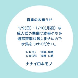 1/9(日)と1/10(月・祝)は 成人式の準備と本番のため 通常営業は致しませんので お気をつけください。