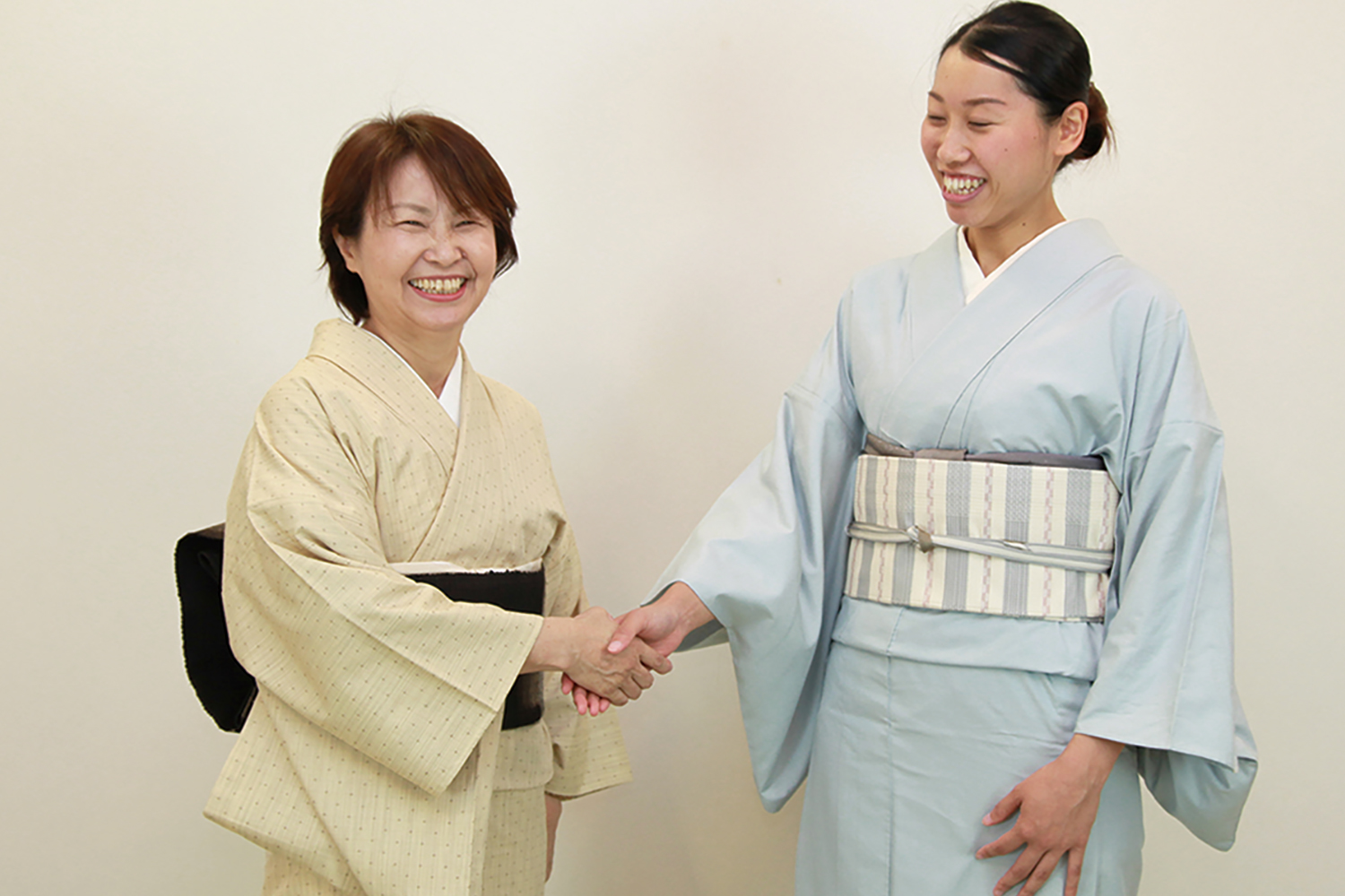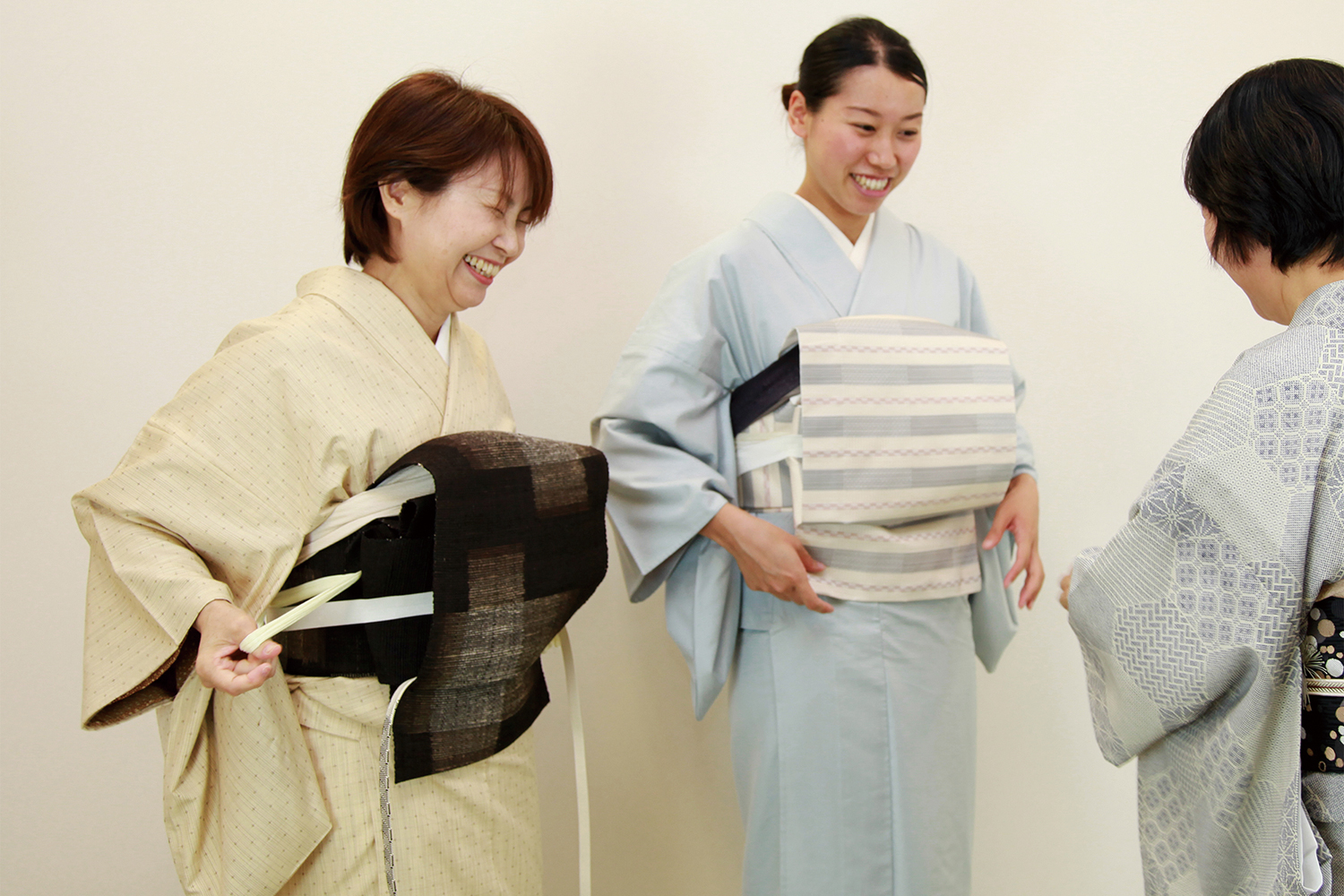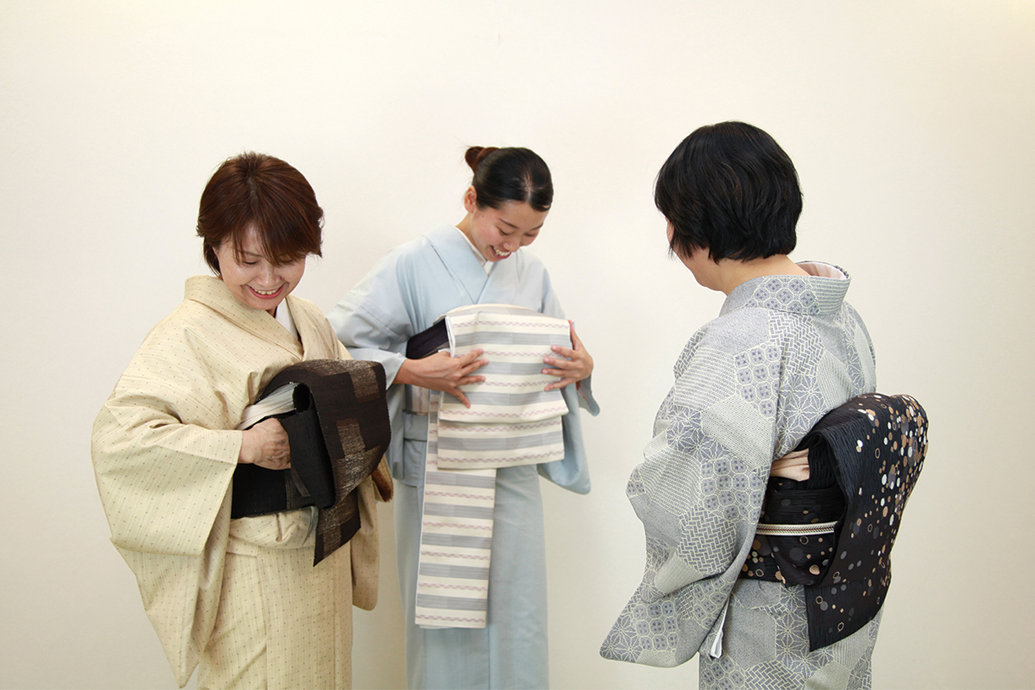近年、着物を着る機会が減りつつある中、着慣れていないぶん、手が後ろへ回らないとの声をよくお聞きします。古くから伝わる前結びは一時的に消えかけた技術でしたが、 なないろキモノ学院ではこれからの時代にあった実践的な着付けと考え、前結びを積極的に推奨しています。